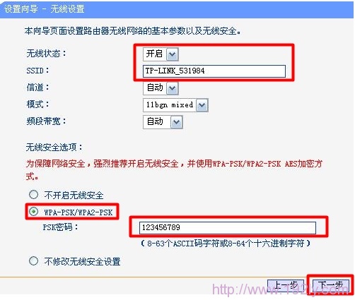 6、配置無(wú)線網(wǎng)絡(luò):在“無(wú)線狀態(tài)”部分勾選開啟,同時(shí)設(shè)定易于辨識(shí)的SSID名稱,“無(wú)線安全”設(shè)為“WPA-PSK/WPA2-PSk”,并設(shè)置一個(gè)用于無(wú)線連接的密碼(例如123456789),最后點(diǎn)擊“下一步”。
