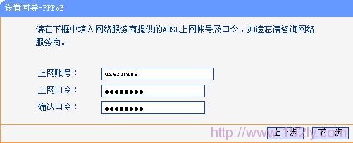 5、填寫PPPOE信息:在PPPOE設(shè)置頁(yè)面填入由您的ISP提供的“上網(wǎng)賬號(hào)”和“上網(wǎng)密碼”,完成后點(diǎn)擊“下一步”。