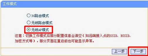 3、設(shè)定工作模式:在“工作模式”選項(xiàng)中選擇“無(wú)線AP模式”–>點(diǎn)擊“下一步”。