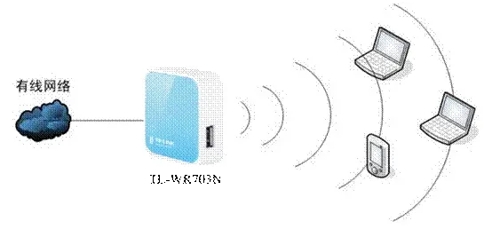 通過(guò)網(wǎng)線將TL-WR703N連接至有線網(wǎng)絡(luò),它可以與網(wǎng)絡(luò)中的路由器或交換機(jī)相接。例如,在酒店或賓館的房間內(nèi),只需將TL-WR703N插入房間內(nèi)的網(wǎng)絡(luò)接口即可。隨后進(jìn)行必要的配置,便可將原本的有線網(wǎng)絡(luò)轉(zhuǎn)化為支持無(wú)線連接的形式。