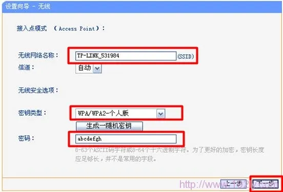 5、無(wú)線設(shè)置:“無(wú)線網(wǎng)絡(luò)名稱”可根據(jù)個(gè)人喜好自定義–>“密鑰類型”推薦選擇“WPA/WPA2”–>“密碼”自行設(shè)定(示例為abcdefgh)–>“下一步”。