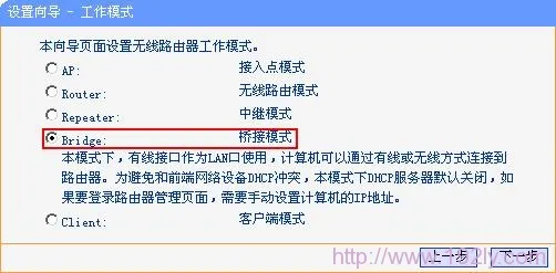 4、選擇工作模式:在工作模式設(shè)置頁(yè)面中選擇“Bridge模式”–>“下一步”。
