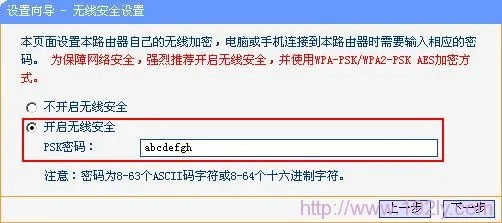 6、設(shè)置TL-WR700N的PSK密碼:選擇“開啟無線安全”–>在“PSK密碼”后設(shè)置自己的密碼,例如abcdefg–>“下一步”。