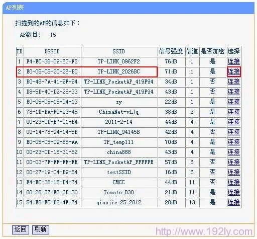 在掃描結(jié)果中找到上級(jí)路由器TL-WR941N的SSID–>點(diǎn)擊“連接”