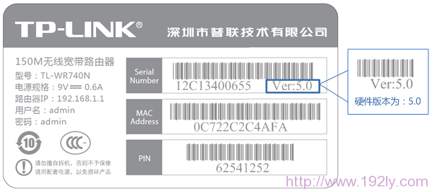 要確定TL-WR845N路由器的硬件版本,請(qǐng)查看設(shè)備背面的錫標(biāo)位置。在錫標(biāo)的 Serial Number 欄中,帶有 Ver(即 Version/版本)標(biāo)注的信息即為設(shè)備的硬件版本。具體如下圖所示: