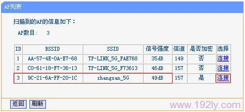 2、從掃描出的列表中找到主路由器的SSID(zhangsan_5G),點擊右側(cè)的“連接”按鈕完成操作,如下圖所示: