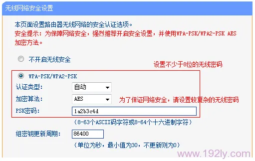 在這里選擇“ WPA-PSK/WPA2-PSK”作為加密方式——>“加密算法”設(shè)置為AES——>輸入“PSK密碼”,此密碼即為無線網(wǎng)絡(luò)(WiFi)的訪問密碼,建議長度超過8個字符,并包含字母與數(shù)字的混合組合。