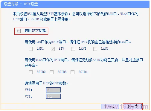 9、配置IPTV功能:勾選“啟用IPTV功能”和“iTV”——>輸入IPTV服務提供商提供的PVC參數(shù)(如不確定,請聯(lián)系寬帶服務提供商)——>單擊 下一步。