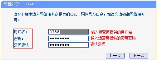 7、填寫寬帶賬號和密碼:“上網(wǎng)賬號”填寫寬帶用戶名——>“上網(wǎng)口令”填寫寬帶密碼——>“下一步”。