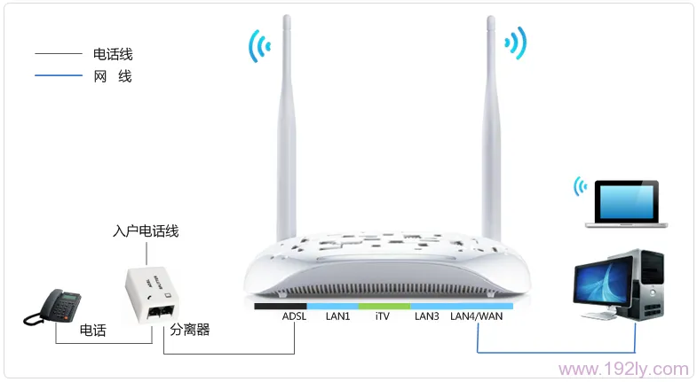將電話線插入TD-W89941N一體機的ADSL接口,并用一根網(wǎng)線連接電腦和TD-W89941N一體機的LAN接口,如下圖所示:
