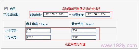 再次點擊“添加新條目”,在“起始地址”和“結(jié)束地址”處分別填寫192.168.1.100至192.168.1.254,設(shè)定上行最小帶寬為200Kbps,最大帶寬為500Kbps;下行最小帶寬為2500Kbps,最大帶寬為3500Kbps,設(shè)置完畢后點擊“保存”。