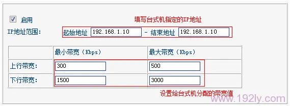 點擊步驟2中的“添加新條目”,在“起始地址”和“結(jié)束地址”欄均填入192.168.1.10,設(shè)置上行最小帶寬為300Kbps,最大帶寬為500Kbps;下行最小帶寬為1500Kbps,最大帶寬為3000Kbps,完成后點擊“保存”。如下所示: