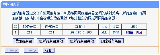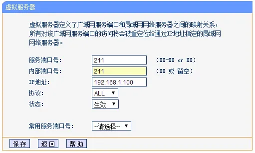2、在彈出窗口中,“服務(wù)端口號”填入:211,“內(nèi)部端口號”同樣填入:211,“IP地址”填入:192.168.1.100,最后點(diǎn)擊“保存”按鈕。