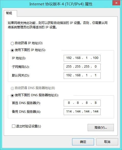 需要將安裝管家婆軟件的計(jì)算機(jī)IP地址設(shè)置為固定值,例如設(shè)置為:192.168.1.100,在后續(xù)配置端口映射時會用到此地址。如不熟悉操作,請參考相關(guān)教程。