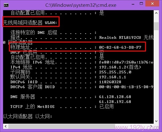 (4)從顯示的信息中定位到無線局域網(wǎng)部分下的物理地址字段,其后的數(shù)值即為無線網(wǎng)卡的MAC地址,例如:0C-82-68-63-DB-F7。