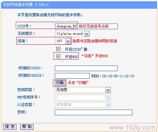 1、進(jìn)入TL-WDR1100的設(shè)置頁面,依次點(diǎn)擊“無線設(shè)置5GHZ”——>“無線基本設(shè)置”,將“SSID號”更改為zhangsan_5G,“信道”設(shè)為157(與主路由器保持一致),勾選“開啟WDS”,點(diǎn)擊“掃描”。