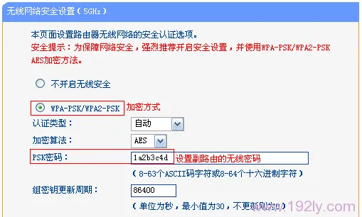 返回“無線設(shè)置5G”頁面,進(jìn)入“無線安全設(shè)置”,選擇“WPA-PSK/WPA2-PSK”,在“PSK密碼”處輸入1a2b3c4d(與主路由器相同),點(diǎn)擊“保存”。