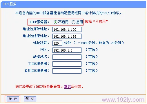 5、禁用TL-WDR1100的DHCP功能:點(diǎn)擊“DHCP服務(wù)器”——>“DHCP服務(wù)”,將“DHCP服務(wù)器”狀態(tài)設(shè)置為“不啟用”,點(diǎn)擊“保存”。
