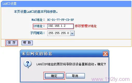 6、修改TL-WDR1100的LAN口IP地址:點(diǎn)擊“網(wǎng)絡(luò)參數(shù)”——>“LAN口設(shè)置”,將“IP地址”調(diào)整為192.168.1.2,點(diǎn)擊“保存”,并在重啟提示框中選擇“確定”。