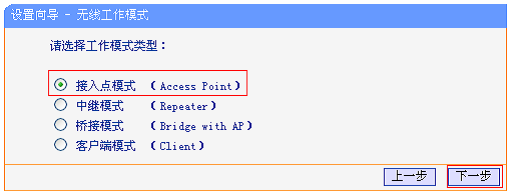 選擇“接入點(diǎn)模式(Access Point)”——>點(diǎn)擊“下一步”。