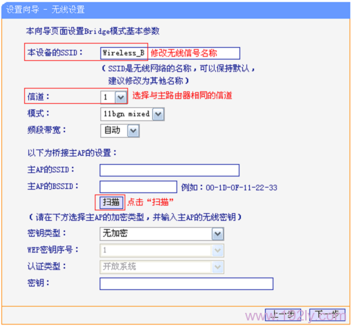 3、執(zhí)行信號(hào)掃描:設(shè)定“本設(shè)備的SSID”,即TL-WR706N自身發(fā)出的無線信號(hào)——>“信道”設(shè)為1,確保與被橋接的無線信號(hào)信道一致——>點(diǎn)擊“掃描”。