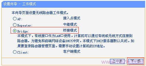 在TL-WR706N路由器上選擇“Bridge:橋接模式”