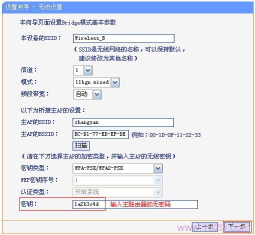5、設置無線密碼:“密鑰類型”選擇:WPA-PSK/WPA2-PSK——>設定“密鑰”(“密鑰類型”和“密鑰”應與被橋接的無線信號相同)。