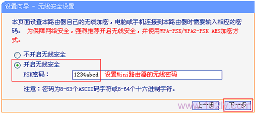 6、設置TL-WR800N無線密碼:勾選“開啟無線安全”——>設定“PSK密碼”——>點擊“下一步”。
