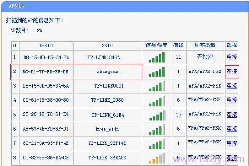 4、從掃描結(jié)果中找到目標(biāo)無線信號名稱(例如:zhangsan),隨后點(diǎn)擊“連接”