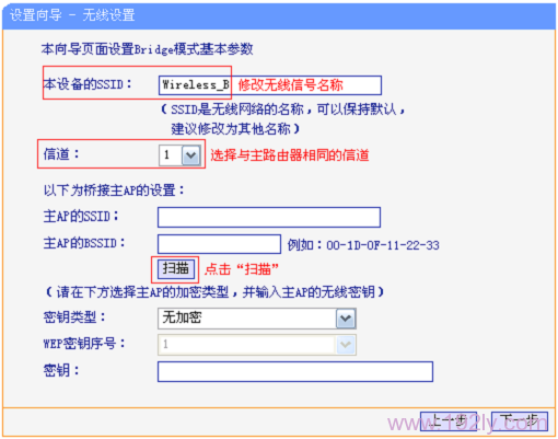 3、更改無線參數(shù)并執(zhí)行掃描:修改“本設(shè)備的SSID”(即設(shè)置TL-WR708N發(fā)射的無線Wi-Fi名稱)——>設(shè)定“信道”(保持與主路由器一致)——>點擊“掃描”。