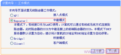 2、選定工作模式:在此步驟中,務(wù)必選擇“Repeater:中繼模式”,然后點擊“下一步”。