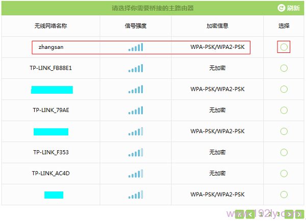 (2)、此時TL-WDR5800無線路由器將自動搜尋周圍的無線信號,找到目標(biāo)主路由器的信號(即需被放大的無線信號,在本例中為:zhangsan)——>然后點擊對應(yīng)的小圓點,完成選擇。
