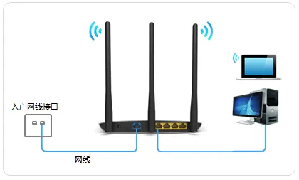 用戶只需準(zhǔn)備一根網(wǎng)線,將TP-Link TL-WDR7800路由器的WAN口連接至運(yùn)營商提供的入戶網(wǎng)線,然后使用另一根網(wǎng)線將路由器的LAN(1、2、3、4)中的任意一個(gè)端口與電腦相連,連接示意圖如下: