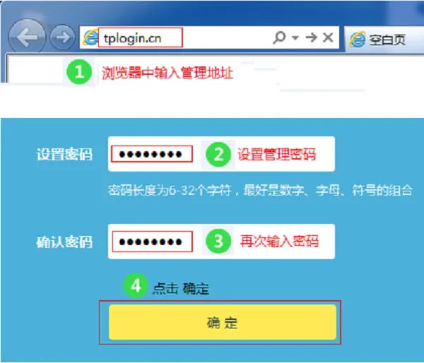 恢復(fù)出廠設(shè)置后,再次訪問tplogin.cn頁面時(shí),會(huì)自動(dòng)彈出創(chuàng)建管理員密碼的窗口,此時(shí)你可以重新設(shè)置一個(gè)密碼。