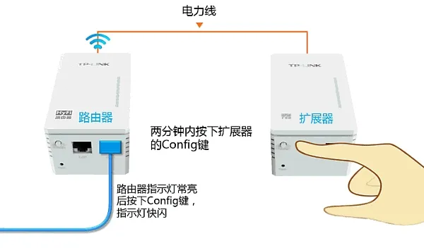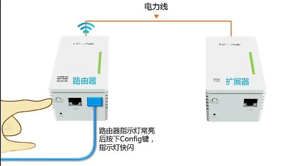 2、當(dāng)HyFi路由器的指示燈持續(xù)亮起時(shí),按下Config鍵,此時(shí)指示燈會(huì)快速閃爍;