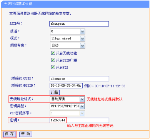 選擇與主路由器相同的“密鑰類型”——>在“密鑰”位置輸入主路由器的無線密碼——>點擊“保存”。