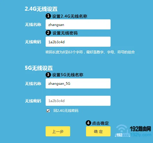 在“2.4G無線設(shè)置”選項下配置“無線名稱”、“無線密碼”——> 在“5G無線設(shè)置”選項下同樣設(shè)置“無線名稱”、“無線密碼”——> 最后點擊“確定”完成設(shè)置。