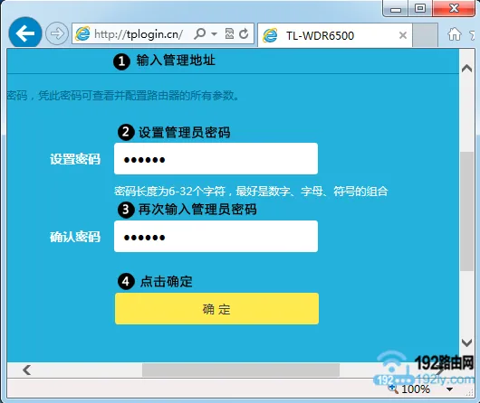 打開瀏覽器,清除地址欄原有內(nèi)容后輸入:tplogin.cn ——> 在出現(xiàn)的設(shè)置管理密碼窗口中設(shè)定一個6到15位的管理密碼——> 點擊“確定”,進入路由器管理界面。
