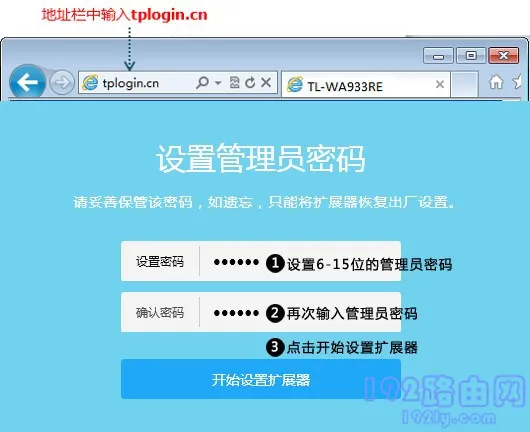 打開電腦上的瀏覽器,在瀏覽器地址欄輸入:tplogin.cn,打開TL-WA933RE的設(shè)置界面——>按照頁面提示,為TL-WA933RE擴展器設(shè)置一個“管理員密碼”,如下圖所示。