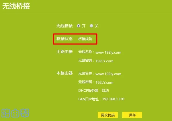 隨后點擊“應用管理”——>“無線橋接”——>觀察“橋接狀態(tài)”的顯示,如果出現:橋接成功 的提示,如下圖所示,則表明TP-Link AC2100路由器已成功橋接到主路由器的信號。