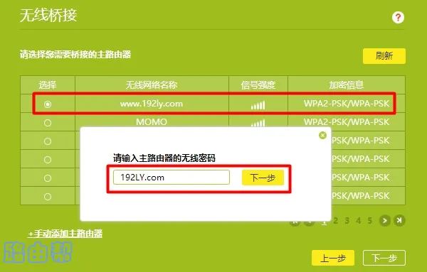 6、路由器會自動搜索附近的無線信號,稍作等待幾秒之后,在掃描結果中挑選主路由器的無線網絡名稱,并輸入對應的無線密碼,如下圖所示。