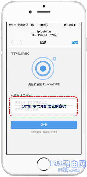3. 然后,在手機瀏覽器中輸入tplogin.cn,打開tplink放大器的設置頁面——>根據(jù)提示為tplink放大器設定一個管理員密碼,如下圖所示。