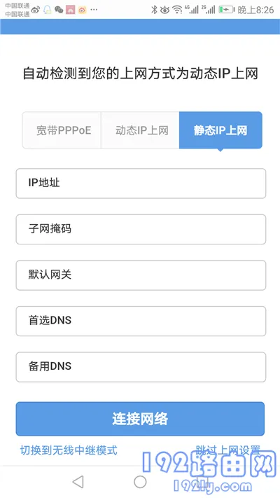 (3)、如果檢測結(jié)果為:靜態(tài)IP上網(wǎng)——>此時(shí)需要在“IP地址”、“子網(wǎng)掩碼”、“默認(rèn)網(wǎng)關(guān)”、“首選DNS”、“備用DNS”中填寫運(yùn)營商提供的參數(shù)信息,最后點(diǎn)擊“立即開始上網(wǎng)”。