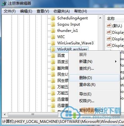 三、例如你要?jiǎng)h除WinRAR軟件,那么你就找到帶有WinRAR的注冊(cè)表項(xiàng),在找到的項(xiàng)中,右鍵單擊選擇“刪除”。刪除完畢后,再關(guān)閉掉注冊(cè)表編輯器,最后重新啟動(dòng)一下計(jì)算機(jī),設(shè)置就算生效了。