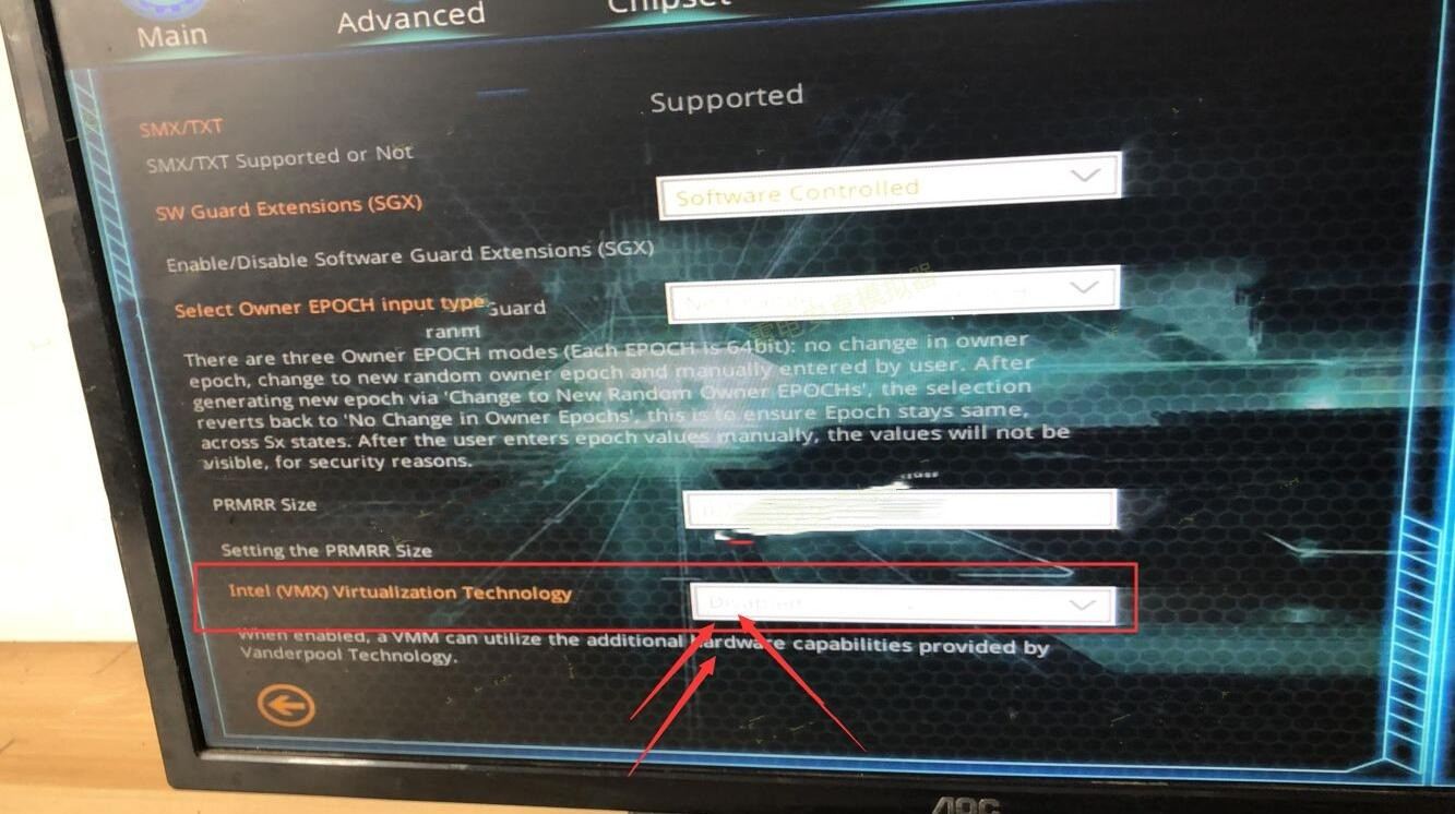 3、點(diǎn)擊“Intel(VMX) Virtualization Technology”選項(xiàng),把“Disabled”都修改為“Enabled”。
