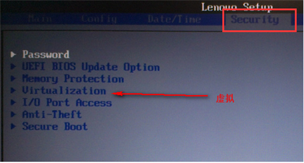 2、在菜單中選擇“Security”,找到Virtualization“,設置成“Enable”的開啟狀態(tài)即可。