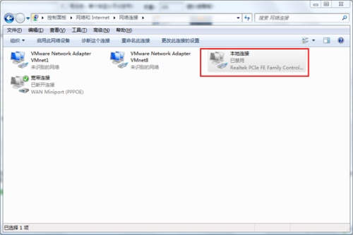 5.此時會打開如下界面,可以找到“本地連接”的圖標(biāo),此時我們可以看到本地連接顯示為“已禁用”的狀態(tài),所以會出現(xiàn)網(wǎng)絡(luò)連不上等一系列網(wǎng)絡(luò)問題,選擇本地連接使用鼠標(biāo)右鍵后選擇“啟用”即可讓網(wǎng)絡(luò)恢復(fù)啟用