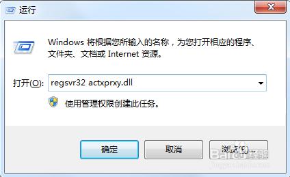 2、在彈出的運行對話框里輸入【regsvr32 actxprxy.dll】命令,點擊確定選項