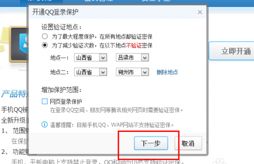 5、建議大家進(jìn)行如下的設(shè)置:在設(shè)置的時候,開通登陸地保護(hù)驗證,當(dāng)然我們可以將部分常用的登陸地加入保護(hù),無需進(jìn)行驗證,也可以關(guān)閉網(wǎng)頁登陸保護(hù)。點擊“下一步”。