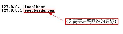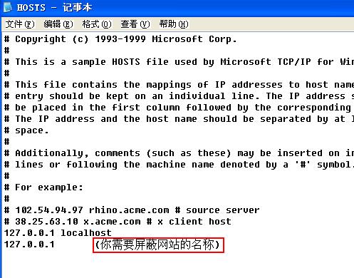 3.在文件的最后添加上:127.0.0.1 你需要屏蔽的網(wǎng)站名稱,然后保存即可。